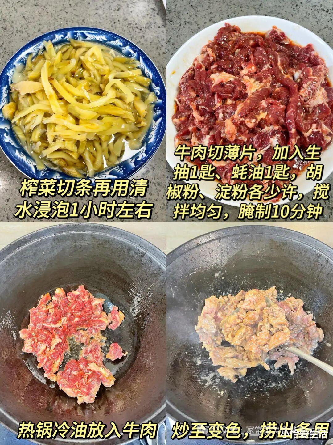 4. 炒香葱姜,下榨菜丝翻炒1分钟,回锅下肉丝,加少许生抽、糖调味即可。