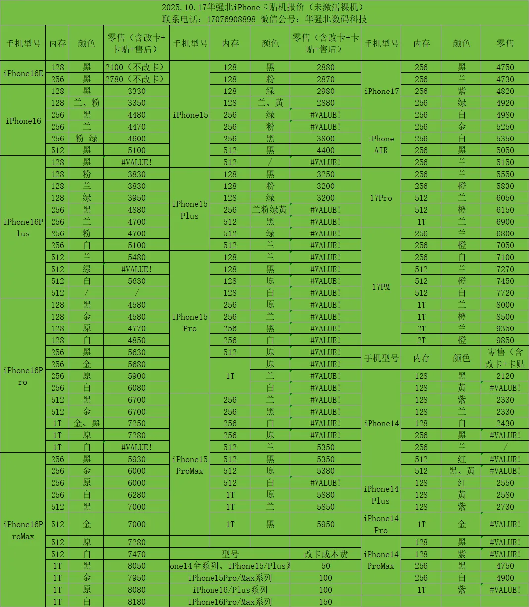 然后和各位汇报一下华强北的卡贴机价格情况,目前除了iPhone17的基础款之外,都是下跌的趋势,其中1iPhone17Pro 256G版本未激活新机档口价格下降到了5450元,一般背包客代购+100元(未改卡),而暴跌的还要属于iPhone Air,目前的价格直接来到了5000元左右(黑色加上代购费5050元),短短的一两周跌了1000左右。当然,超雪改卡方案出来之后一定会涨价。