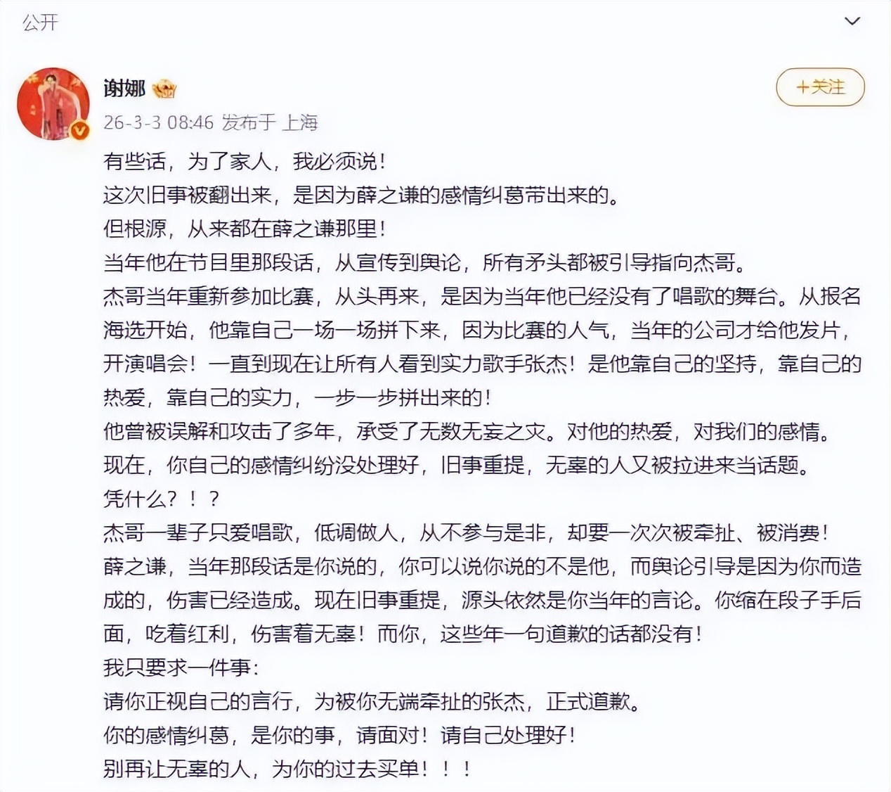 3月3日,向来以嘻嘻哈哈形象示人的谢娜突然发布长文,点名道姓喊话薛之谦:“请你正视自己的言行,为被你无端牵扯的张杰,正式道歉。”