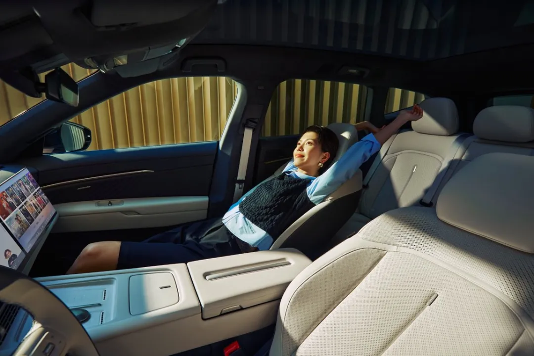 座舱采用95%全软包覆盖,座椅选用Nappa真皮材质,经过40道工序打磨,麂皮绒包覆顶棚。副驾配备14向电动调节+腿托+10点气动按摩功能,搭配柔光化妆镜打造“女王副驾”;二排座椅支持10°靠背调节,集成加热功能、折叠桌板,中央扶手内置杯托,满员乘坐时仍能保证舒展空间。