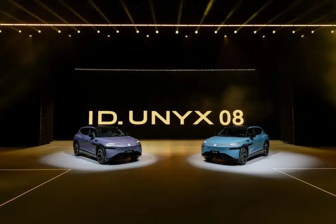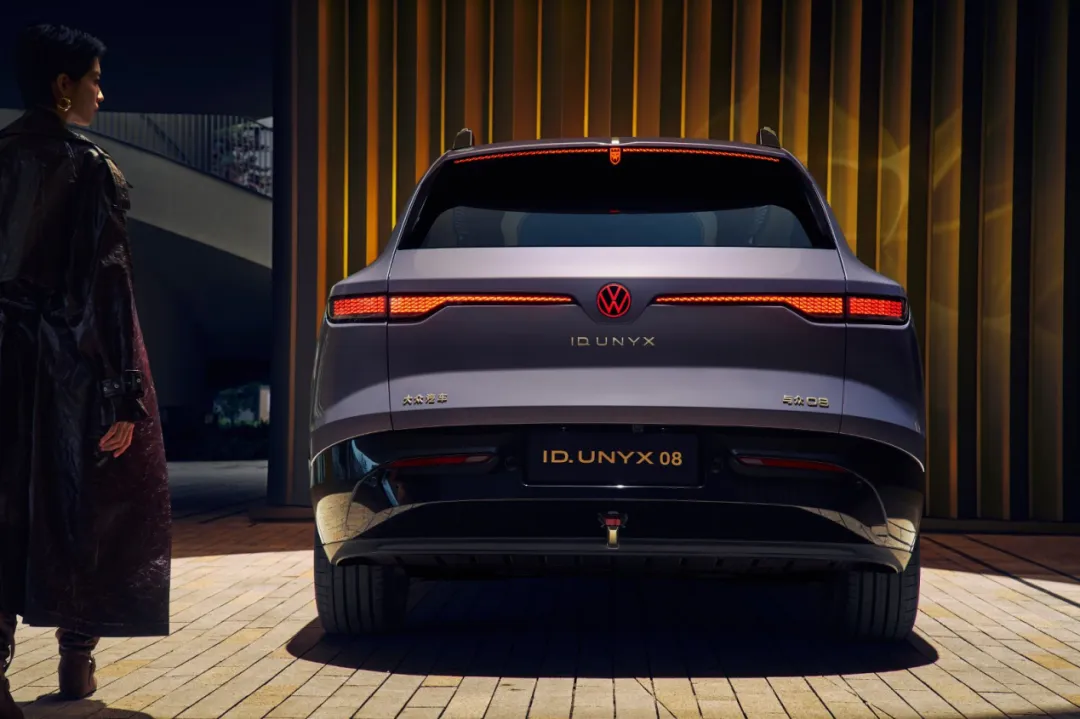 车尾部分,与众08采用狭长平直的尾灯组,相比车头要相对内敛,配备可发光的红色尾标,下侧为“ID.UNYX”金色标识,尾门右侧“与众08”标识表明身份信息。
