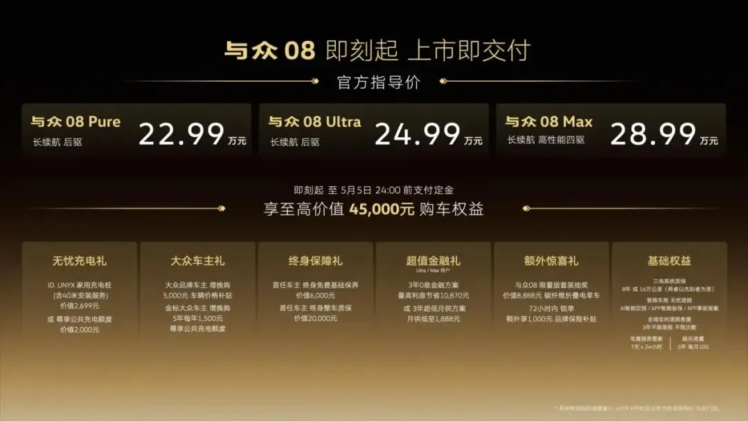 总结,售价22.99万起的金标大众与众08,以中德融合的产品研发思路,在设计、智能、舒适、三电、安全等核心维度均展现出扎实的产品力。对于追求品质与智能的消费者而言,与众08的到来提供了兼具德系底蕴与本土创新的选择,其后续市场表现,也将成为金标大众产品攻势的重要试金石。