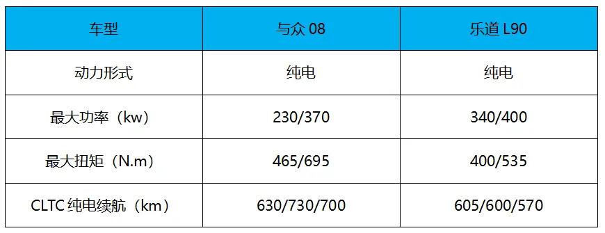 动力系统方面,与众08提供单电机和双电机两个版本。单电机版本最大功率230千瓦,超乐道L90单电机版150千瓦的输出;双电机版本综合功率可达370千瓦,与蔚来ES8双电机版(综合360千瓦)不相上下。