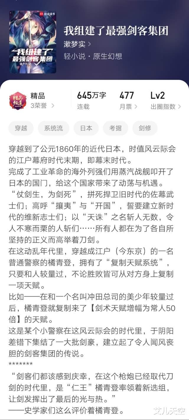 3、漱梦实《我组建了最强剑客集团》完结漱梦实的这本剑戟文也完结了。他的剑戟三部曲的最后一本之前已经发了,转去大漂亮那边走枪剑双绝路线了。