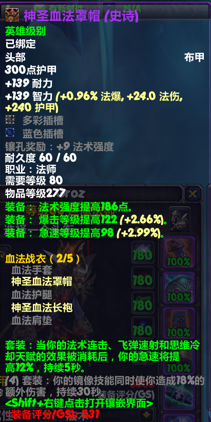 套装是2件血法战衣,然后其他的装备都主堆命中和急速!