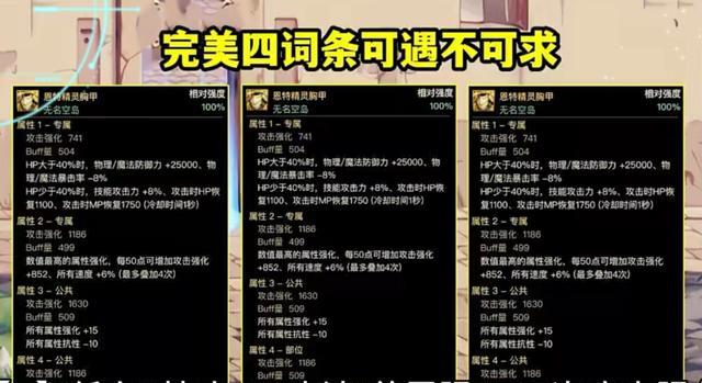 四个装备千万不能丢出现这几个词条,上衣,恩特精灵胸甲,定制属性,每50点最高属强增加攻击强化852,6%三速,最多叠加四次。