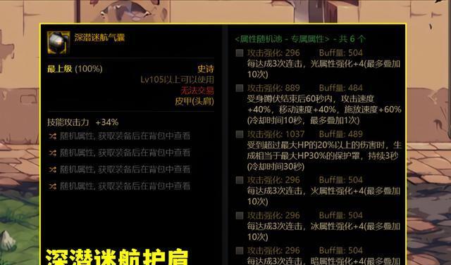 头肩,深潜迷航气囊,定制属性,每联击敌人三次增加四点冰属性强化,最多叠加十次,定制属性进入地下城时,每30秒消耗五个无色小晶块,30秒内攻击强化加2964,所有速度加20%。