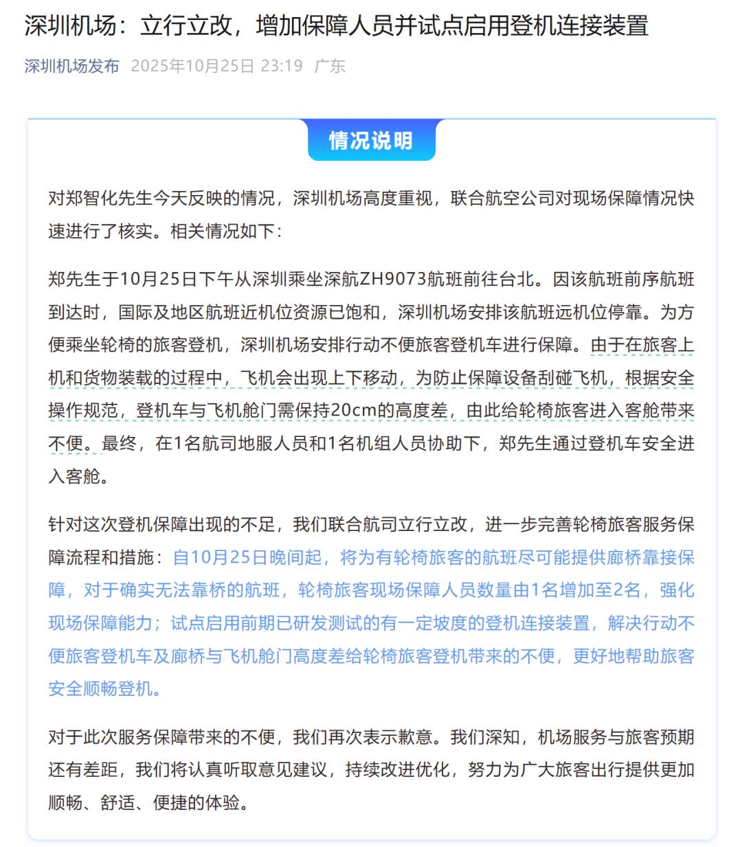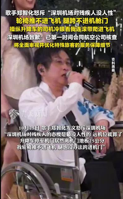 有意思的是,深圳机场的回应一开始有点 “跟不上节奏”。郑智化发文当天下午,有记者打电话问机场客服,对方说 “没收到反馈,不清楚情况”,还提醒 “行动不便得提前向航空公司申请轮椅服务”。可转头,机场官方账号就跑到郑智化评论区道歉,当晚还发了详细的整改通知 —— 这转变速度够快,可细品细节,还是能看出 “服务意识” 的漏洞。