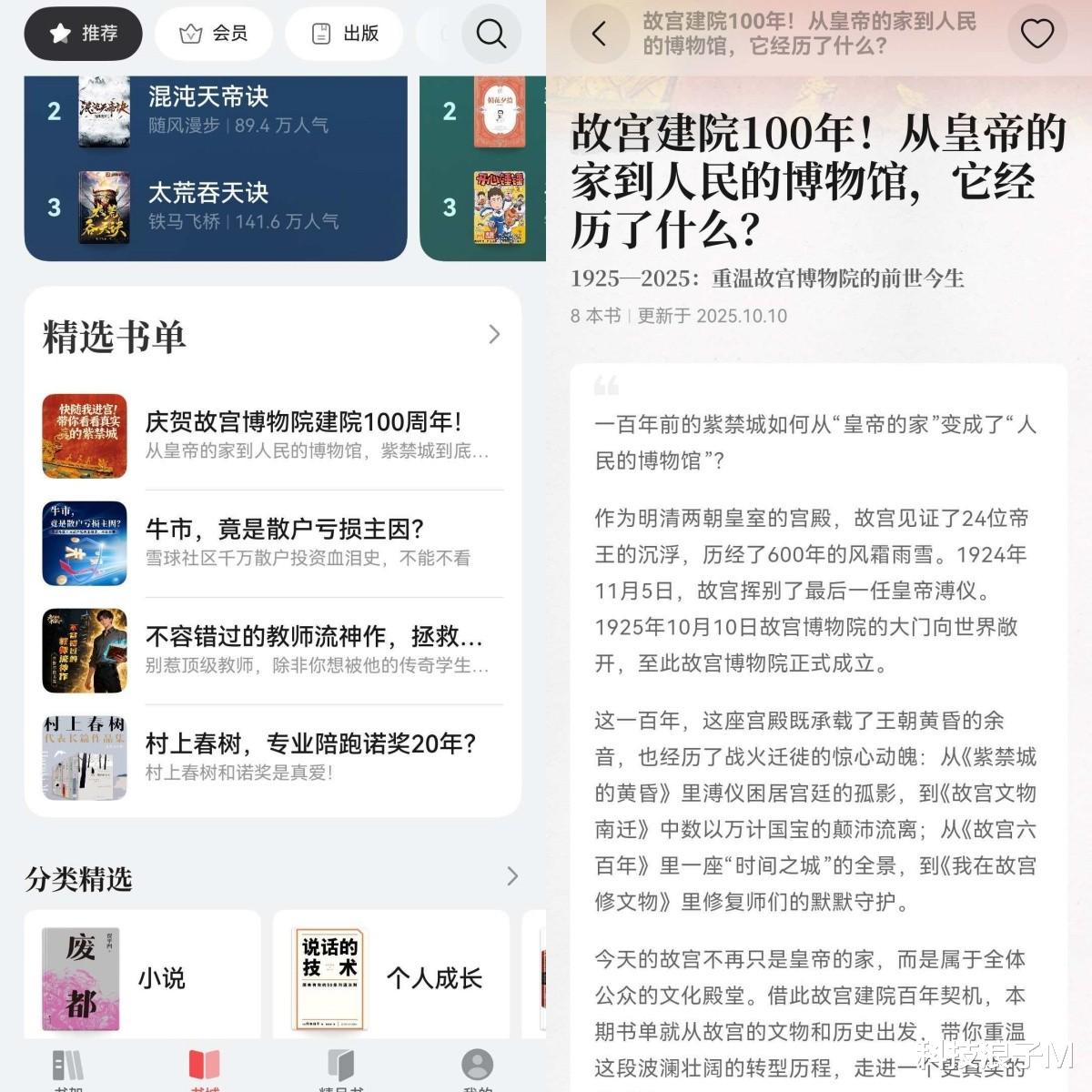 此外,书单里还有《紫禁城的黄昏》《故宫六百年》等书籍,每一本都是一个独特的切面,共同拼凑出一个更立体、更厚重的故宫。华为阅读会员近期可以阅读的出版书籍数量明显增多,之前需要额外付费的书目也纳入了会员权益。这样我也能畅读这份故宫建院100周年书单,我能够更专注在阅读本身,而不是纠结要不要购买。