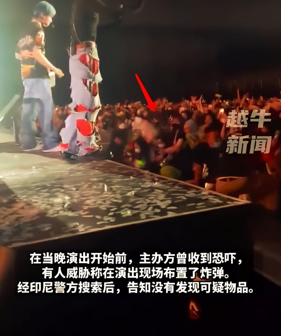 而在舞台上的视角回看事故发生的瞬间,很明显是最前排的粉丝受到后面粉丝的推搡和挤压,前面的保护栏直接压倒,随后后边的人失去平衡接连倒地。更离谱的是,在演唱会举办之前,还有人威胁主办方称会场安放了炸弹,还好这是个恶作剧。