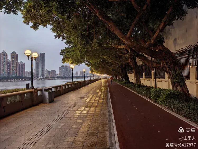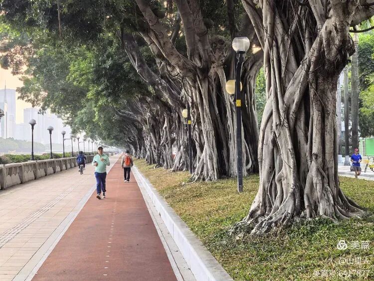 二沙岛横亘在珠江中,这一侧属于珠江的内河道。联排的榕树构成“碧道”的绿荫屏障,晨曦中有种说不出的舒适通透与自然感受。养眼行并不夸张。
