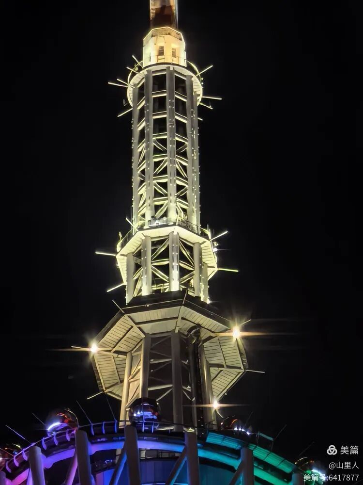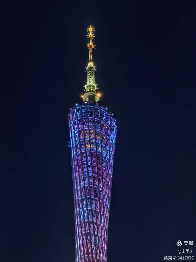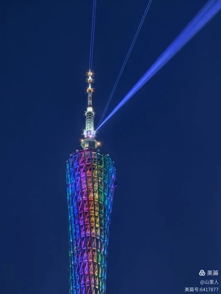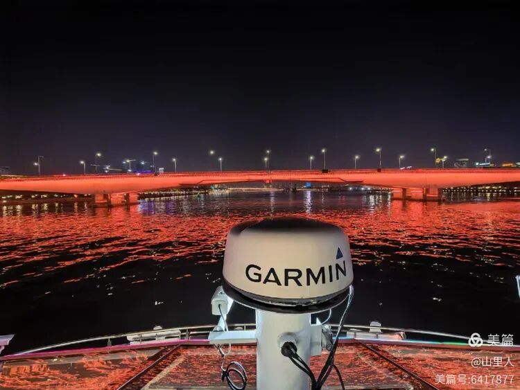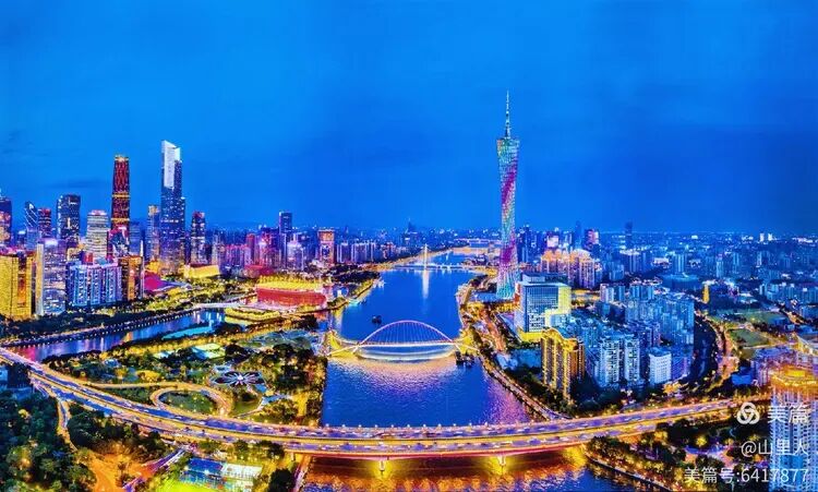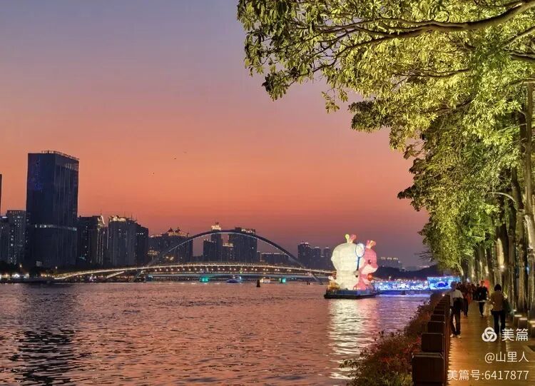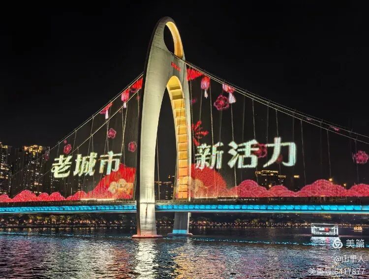珠江在广州中心地带穿越,桥梁是灯光秀带。海心沙夜游轮的广告就是它的写真。