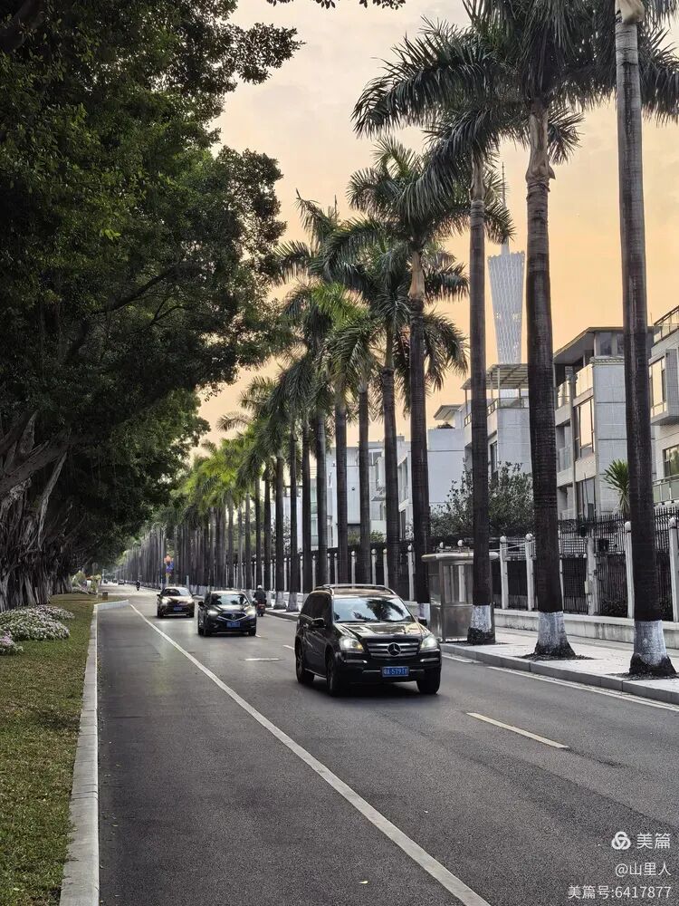 二沙岛北段江边步道与内陆机动车道并行,绿色隔离带的规划,南国特有的椰子林以及榕树,构成那里的街景。