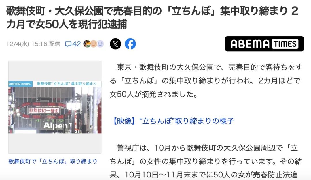 从今年10月起,警视厅加大了对歌舞伎町及大久保公园周边区域的巡逻与整治力度。据统计,自10月10日至11月底,已有50名女性因涉嫌违反《卖春防止法》被警方逮捕。这些女性多为无固定住址者,其中部分人表示因生活窘迫或家庭变故才走上这一道路。