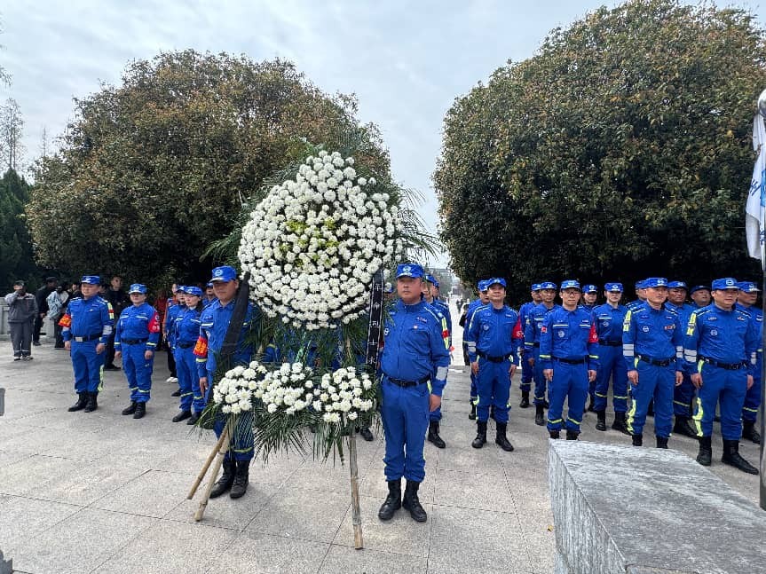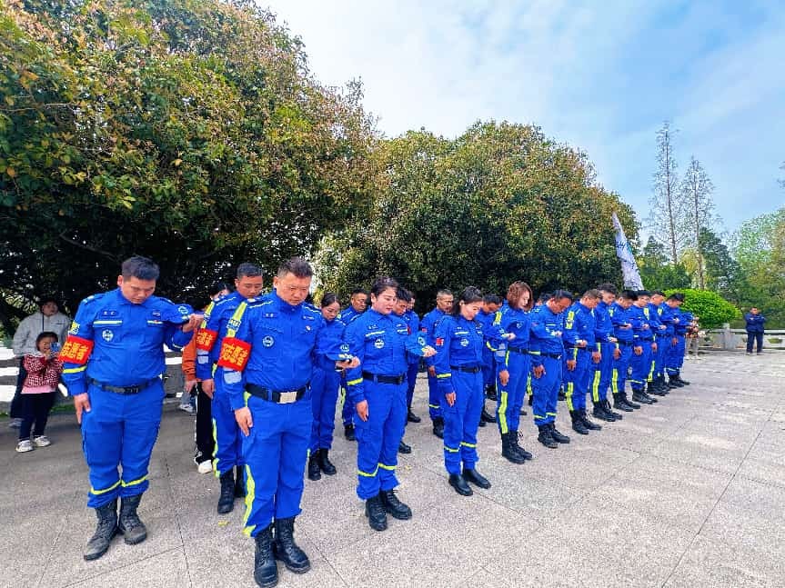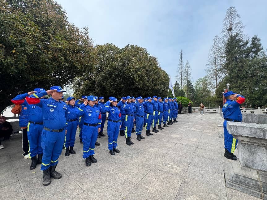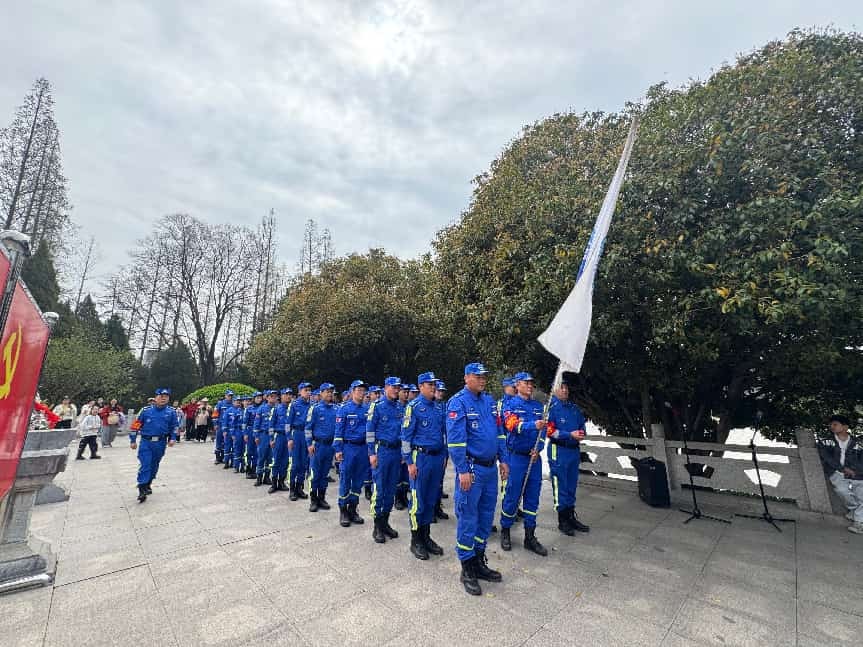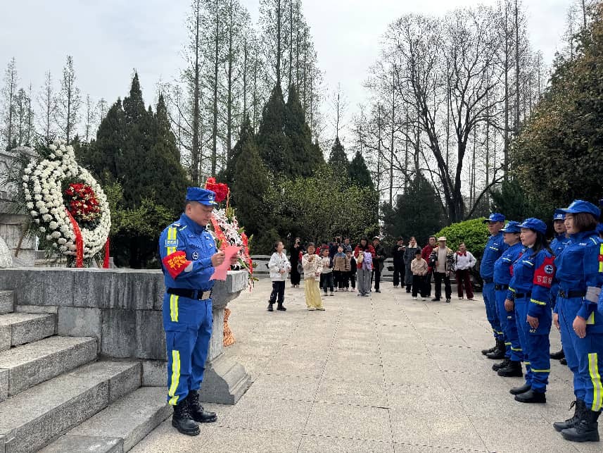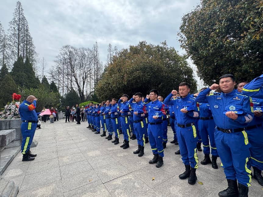 紧接着,队长沈峰代表队伍向革命烈士致悼词。他深情回顾了烈士们抛头颅、洒热血的英勇事迹,号召全体志愿者要以烈士精神为指引,不忘初心,牢记使命。悼词结束后,全场肃立敬礼,告慰英灵。随后,由苏蓝救援队党支部书记带领全体党员及队员重温入党誓词。面对鲜红的党旗,大家握紧右拳,庄严宣誓,铿锵有力的誓言回荡在陵园上空,表达了对党忠诚、誓死捍卫的坚定决心。
