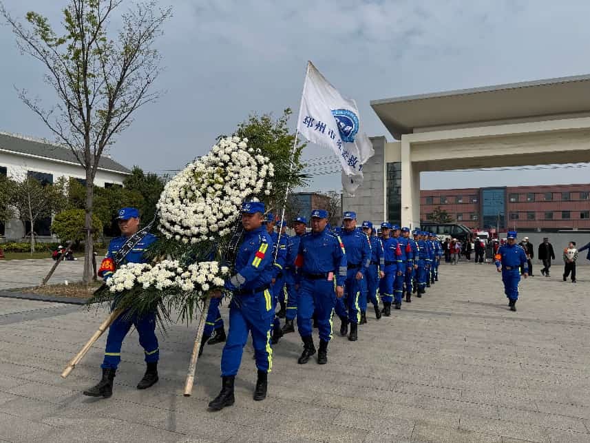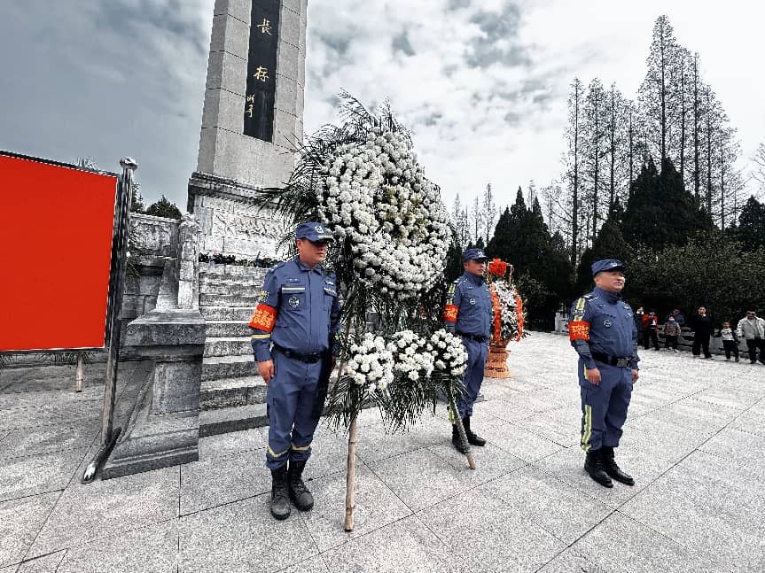 活动现场,松柏凝翠,纪念碑高耸挺拔。救援队的平安志愿者们整齐列队于纪念碑正面平台,神情肃穆,站姿挺拔。随着主持人一声令下:“邳州市苏蓝救援队碾庄烈士陵园祭扫活动正式开始!”整场祭奠仪式在庄严的气氛中有序展开。