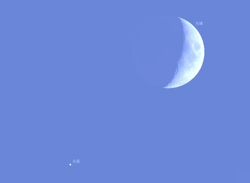 2025年6月1日17:49火星合月(视赤经9h36m34s),地心所见火星在月球以南1.39度的地方。从6月1日傍晚开始到深夜,在西方的天空中可以看到上弦前2天的月亮和火星非常接近。在月亮的左下方有以1.3等红色发光的火星。