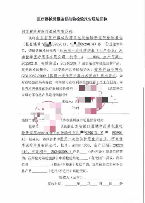 同年9月,该批防护服被淄博市市监单位抽检,委托山东省医疗器械和药品包装检验研究院(下称“检验研究院”)检测。12月,淄川区市监单位执法人员孙某鹏依据该院Y0829013号检验报告,对张先生公司作出253.76万元罚没款处罚。蹊跷的是,相关送达回执显示,Y0929013、Y09014号(收到的编号是"08"而送达回执编号显示是"09")两份报告已于当年10月送达,但张先生始终未收到Y14号报告,且孙某鹏后续称发给张先生的那份处罚报告“不起法律效力”,如今该处罚报告已提交至山东省药品监督管理单位,但检验研究院与淄川区市场监管单位均不认可。