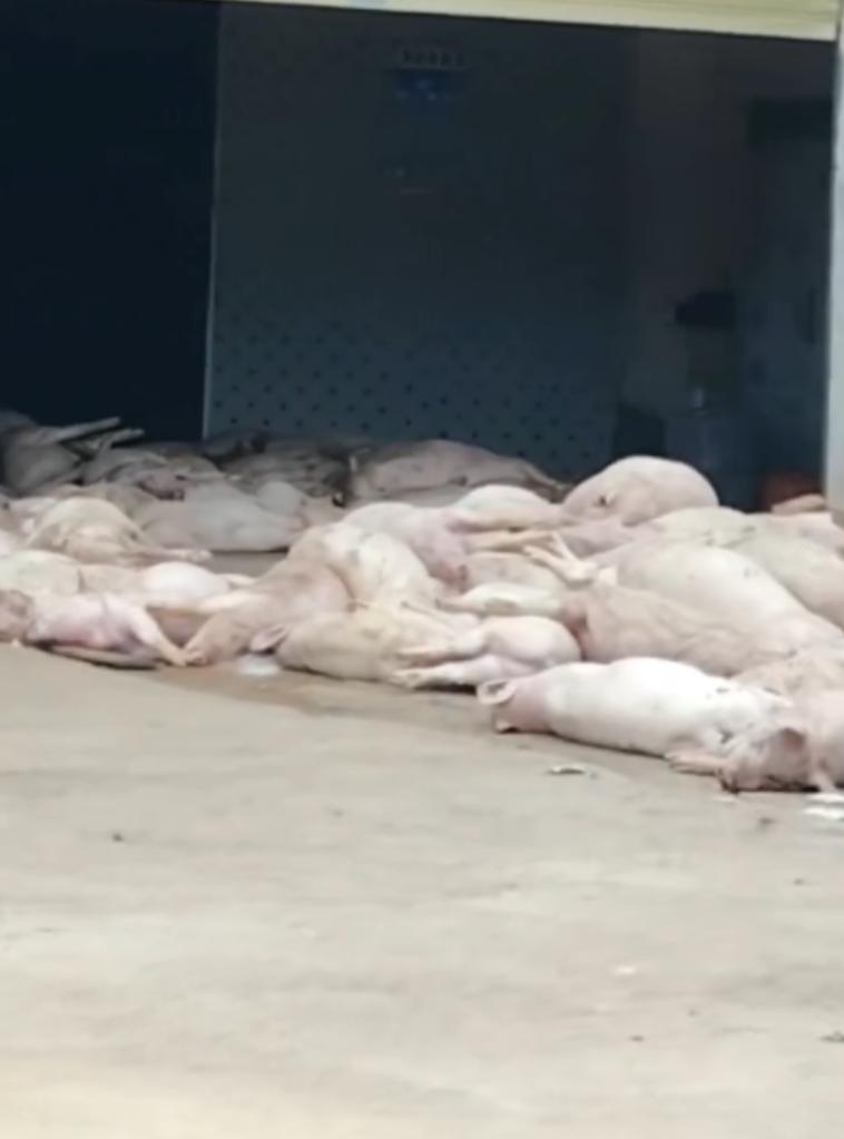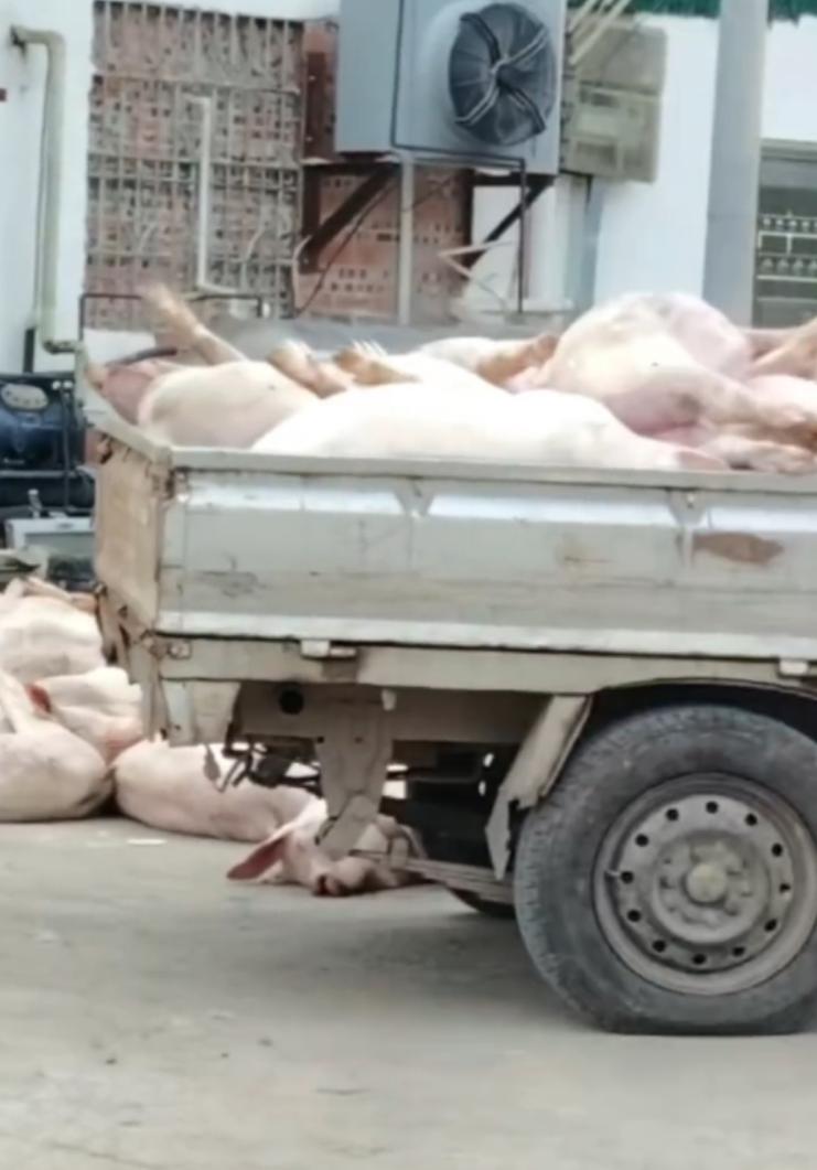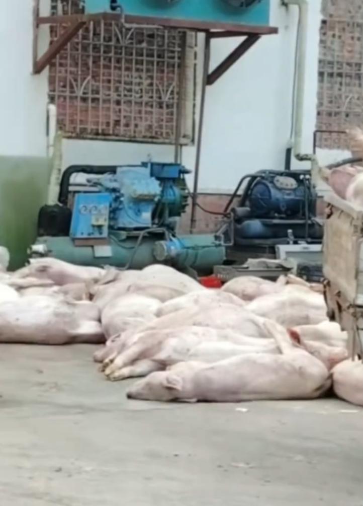 视频是网友偶然拍到的,画面里的 “广东粤光肉联食品有限公司” 简直颠覆认知:厂区内外满地垃圾,死猪随意堆在水泥地上,有的还没从运输车上卸下来,白色的猪尸一眼望不到头,别说消毒设备了,连块遮脏的塑料布都没有。拍摄者气得直接举报,“这哪是食品厂?分明是黑心窝点!”