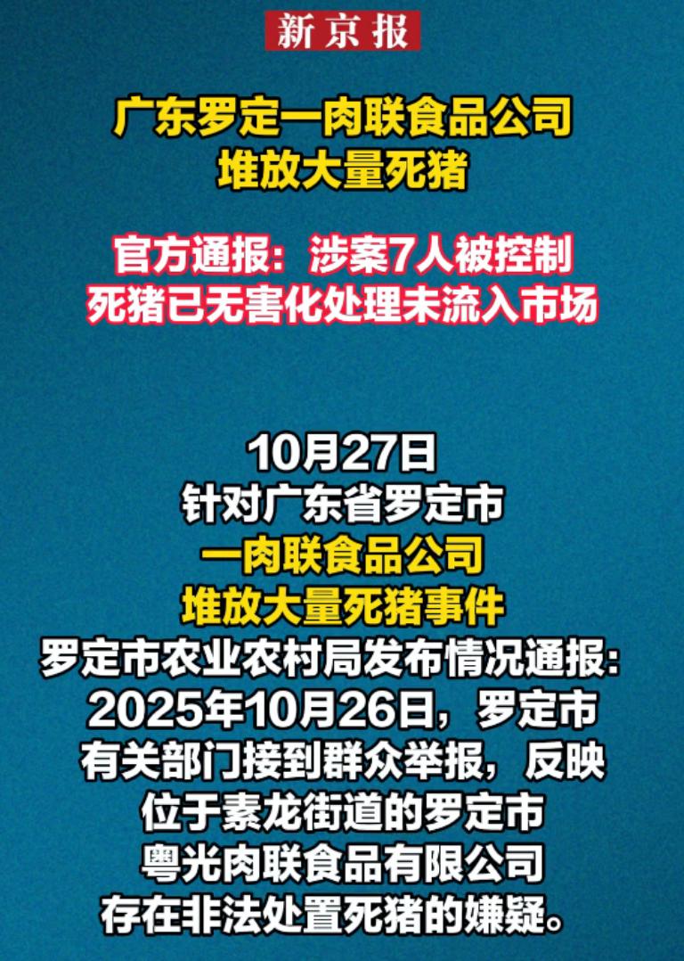 好在相关部门来得快,10 月 26 日接报后,农业、市场监管、公安立马组队赶过去,当场就控制了工厂负责人,7 个涉案嫌疑人全被带走。第二天罗定市农业农村局就发了通报:确认是非法处置病死猪,已经采样送检、全面消杀,所有死猪都交给专业公司无害化处理了,万幸没流入市场。