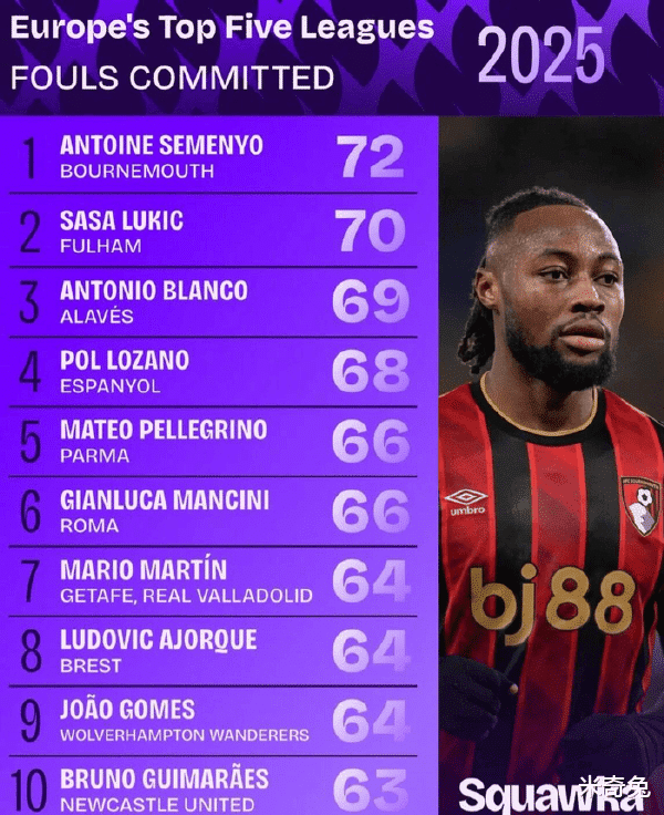 值得一提的是,在2025年,塞门约还是五大联赛中犯规次数最多的球员。他的防守技术并不算好,但就是靠积极性来帮助球队。