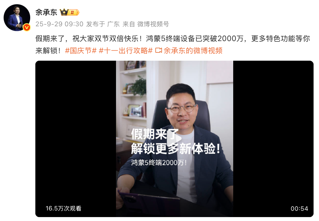 9月29日,华为常务董事、终端BG董事长余承东宣布:鸿蒙操作系统 5终端数量突破2000万,并感谢大家的支持。他还回顾提到,鸿蒙5终端数量从0到1000万用了近10个月,而从1000万到2000万仅用了短短2个月。
