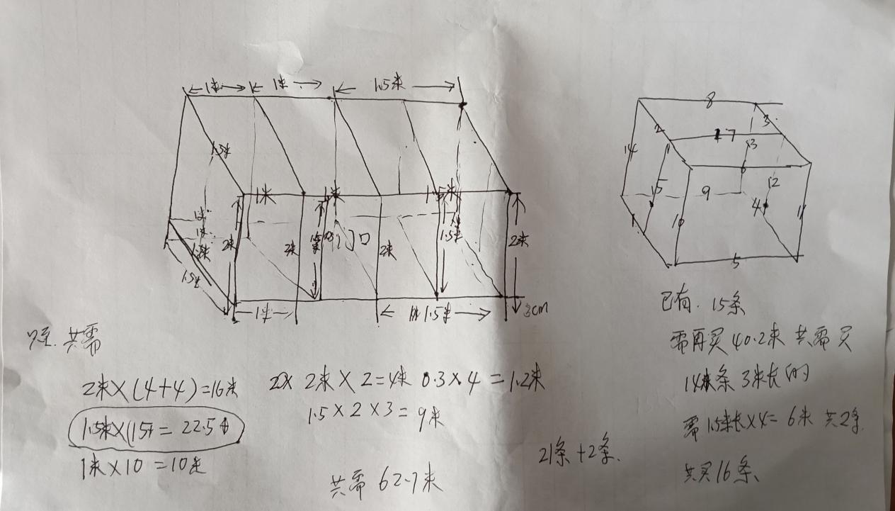三、材料预算与时间安排为了控制成本,我决定尽量利用旧鸡屋的可用材料,比如原来的铁丝网、万能三角铁等。再补充购买一些万能三角铁、螺丝、塑料胶、树脂瓦、脚垫等新材料。经过初步预算,总共需要花费600多元。初步数量都写在设计图上。