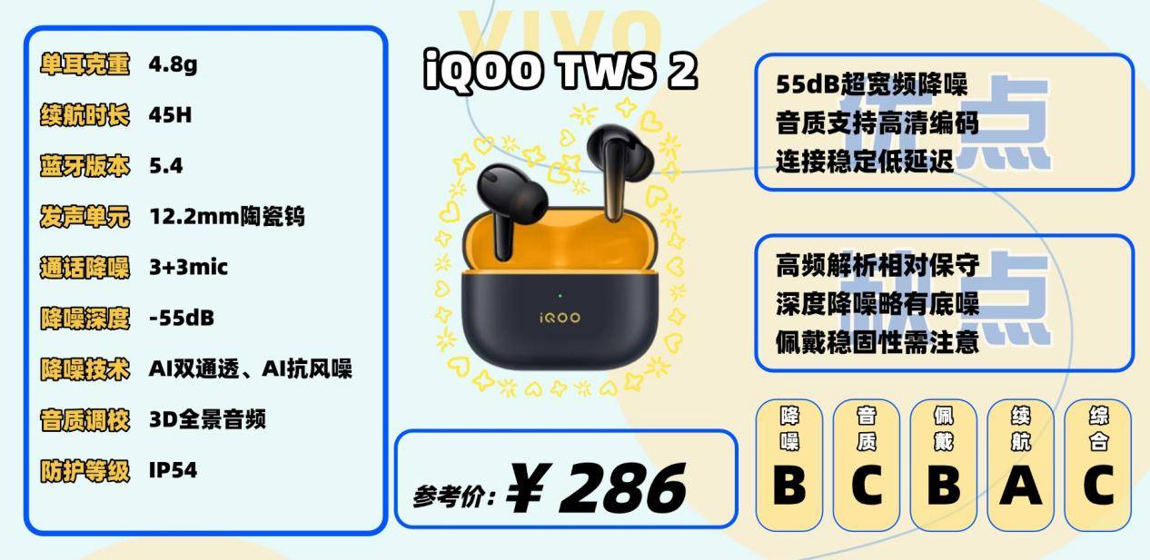 音质方面,iQOO TWS 2硬件配置挺厚道的。它采用高通第二代S3芯片,支持LDAC和aptX Adaptive高清音频传输,单元用的是12.2mm陶瓷钨复合振膜。整体听感偏向流行取向,中频人声清晰,低频有力但不过头。高频部分则相对克制一些,细节和延展性稍微保守,不过对于日常听歌或看剧来说已经够用了。