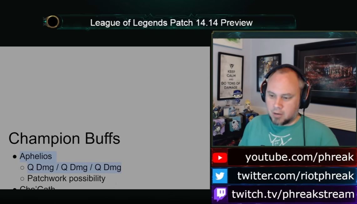 在本周的14.14版本改动分析中,Riot Phreak解释了开发团队对厄斐琉斯的调整方向,他们想让厄斐琉斯更倾向于普攻输出,而非当前版本最流行的技能输出。“我们其实并不喜欢现在的厄斐琉斯像个法师的状态。他的主要出装路线是E技能点满,然后快速出收集者……我们更希望他成为一个依赖攻击输出的角色,而不是一个5000码射程的爆发法师。”