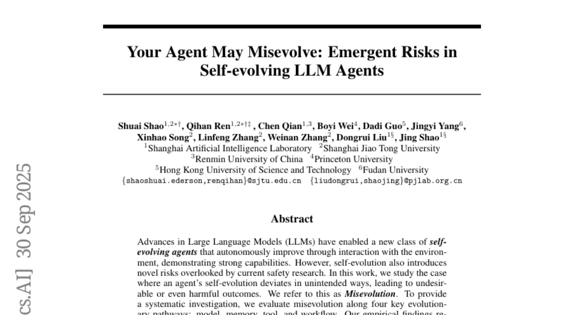 在人工智能飞速发展的今天,一个令人担忧的现象正在悄然浮现。上海人工智能实验室、上海交通大学、中国人民大学、普林斯顿大学等多家知名研究机构的科学家们,在2025年9月发表了一项突破性研究,首次系统性地揭示了自进化AI智能体可能出现的"误进化"现象。这项名为《Your Agent May Misevolve: Emergent Risks in Self-evolving LLM Agents》的研究论文,由邵帅、任启涵等研究人员共同完成,为我们敲响了AI安全的警钟。