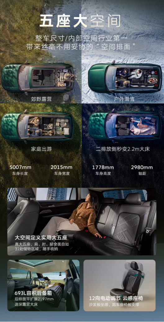 越级车身尺寸为大五座布局奠定基础,二排放倒后可形成2.2米"大床",满足露营、滑雪等场景需求。车内设31处储物区域,进深浅物区设计便于取放物品;后备箱常规容积693L,后排座椅放平后拓展至2197mm,装载能力突出。12项电动调节云感座椅兼顾舒适性与支撑性,提供沙发级乘坐质感。