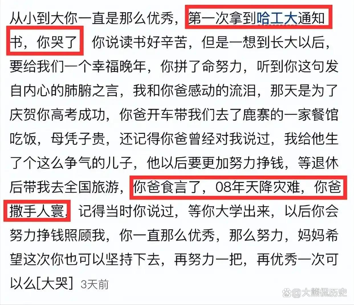 蔡湘孟的父亲于2008年不幸离世,自那以后,母子二人便相互扶持,相依为命。他曾是母亲心中唯一的希望,那个在考入哈尔滨工业大学后泪流满面,誓言要为母亲撑起一片天空的少年。他立志要勤奋工作,赚取足够的财富,精心照料母亲——然而,这一次,他的承诺未能如约实现。