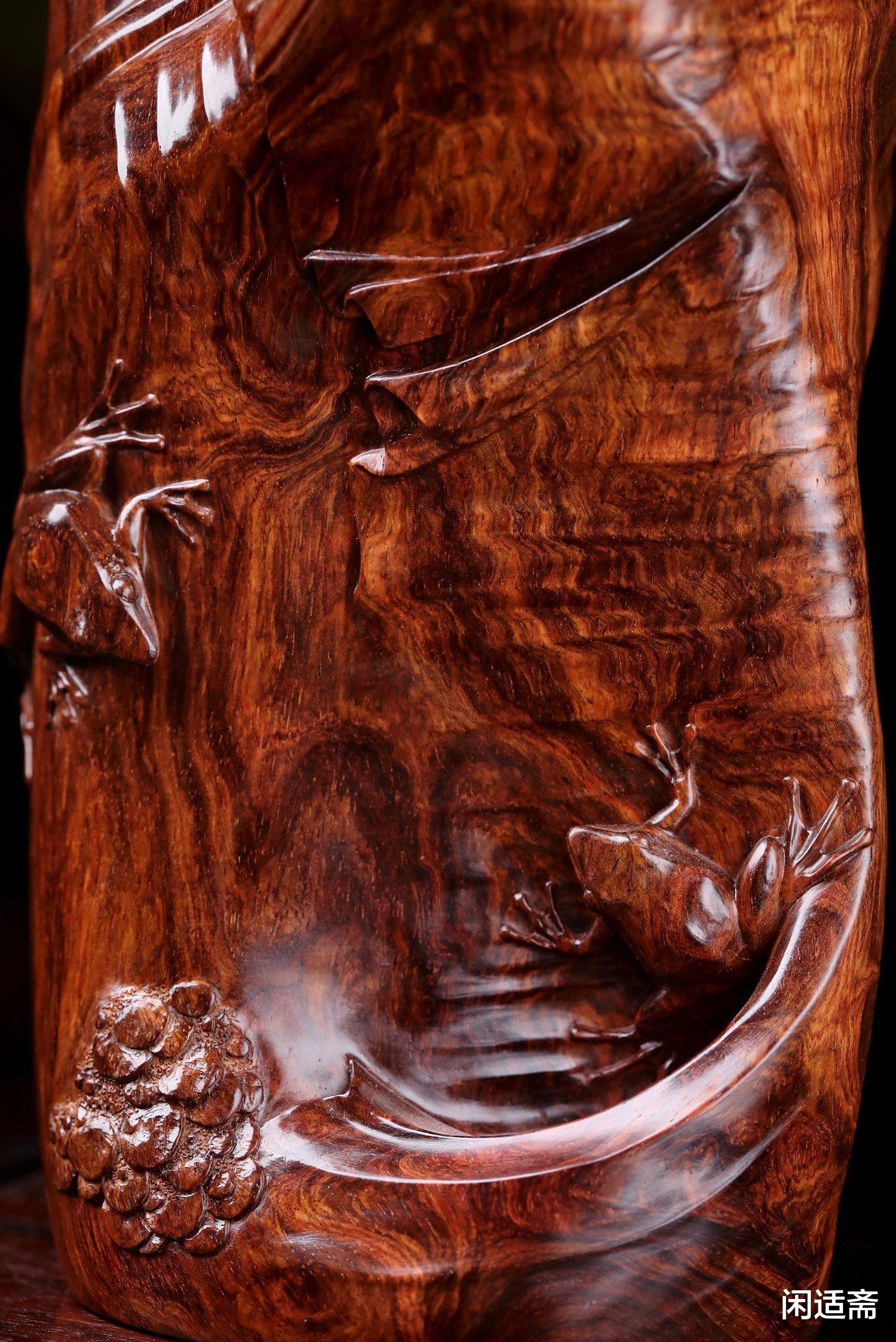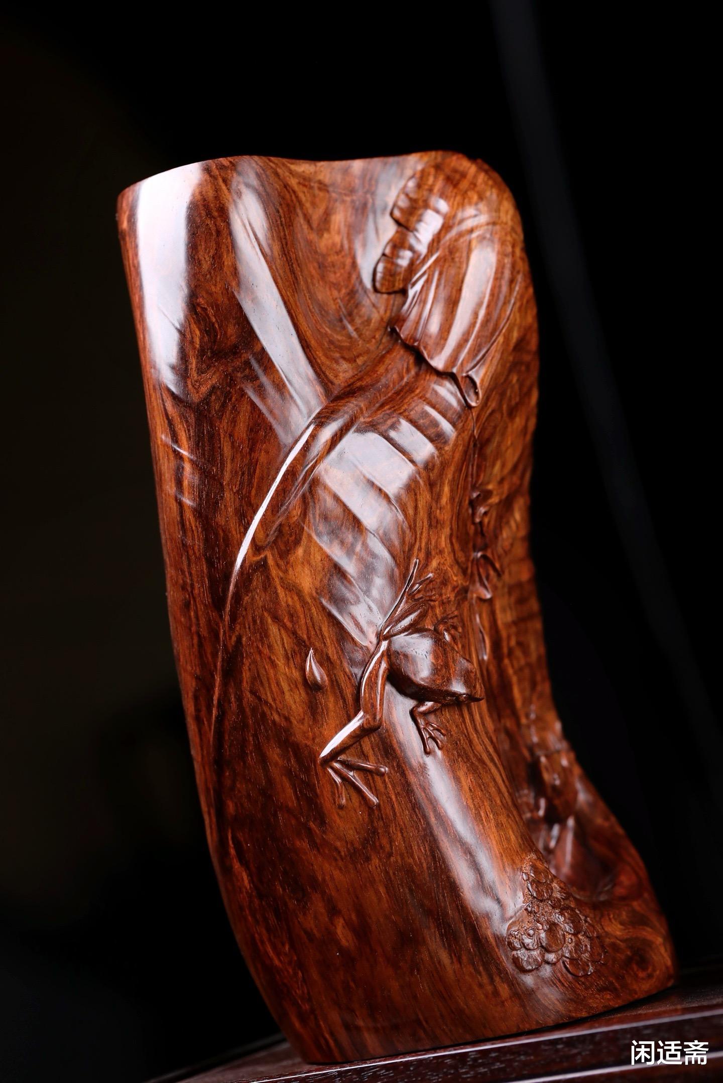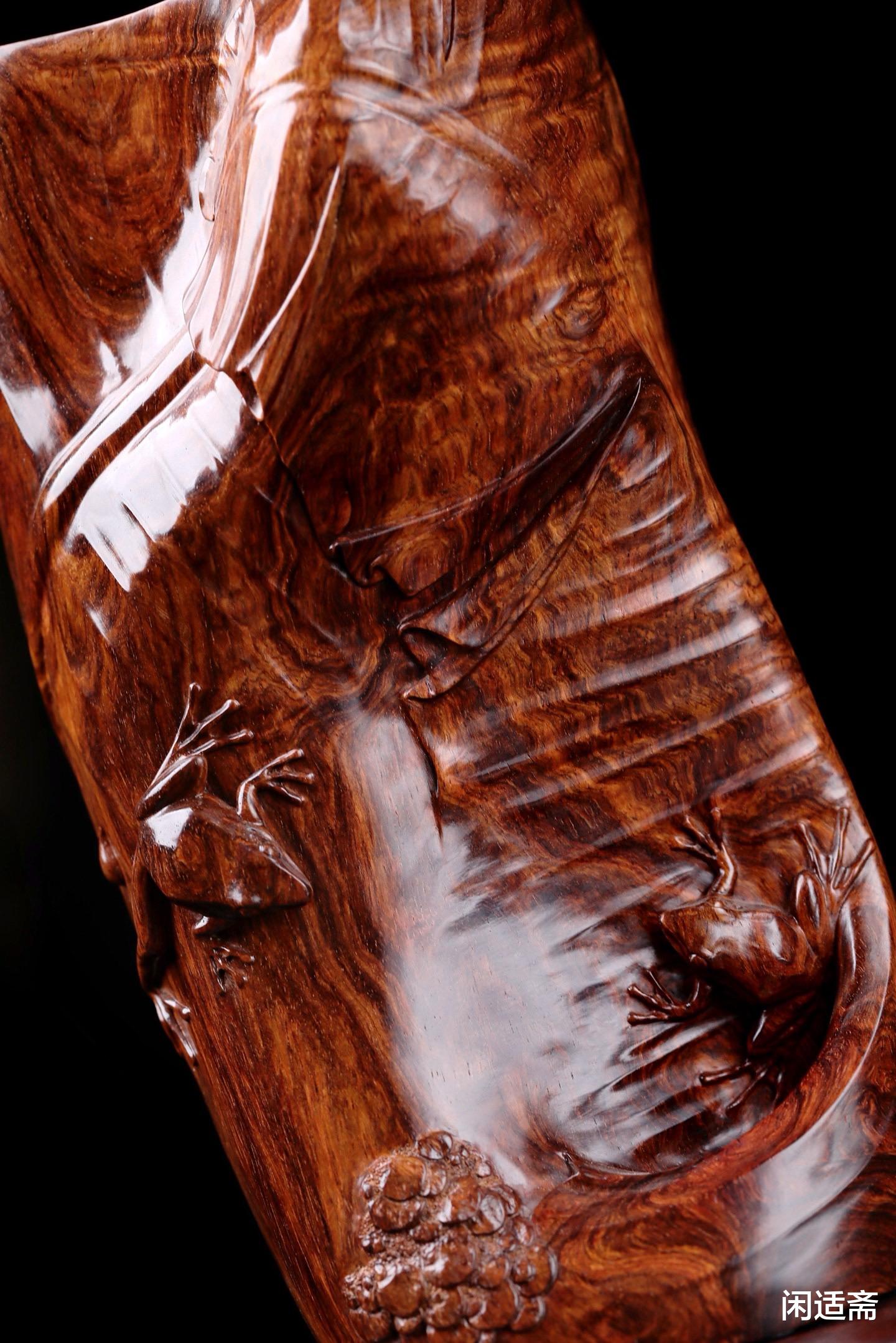 笔筒由匠人手工雕刻,以芭蕉叶为形,深刻技法雕出叶脉舒展、叶缘翻卷的真实质感,刀刀老辣却无匠气;叶间青蛙更显神妙 —— 鼓目昂首,四肢蜷缩欲跃,既有木材天然肌理,又藏生灵跃动之趣,“呱呱来财” 的祥瑞寓意,藏在这方寸之间,雅趣与吉意兼得。