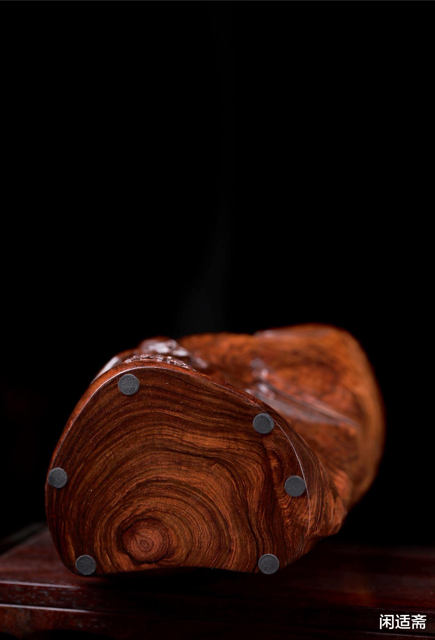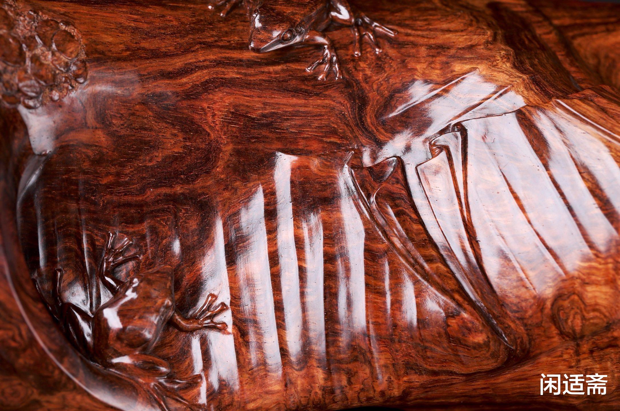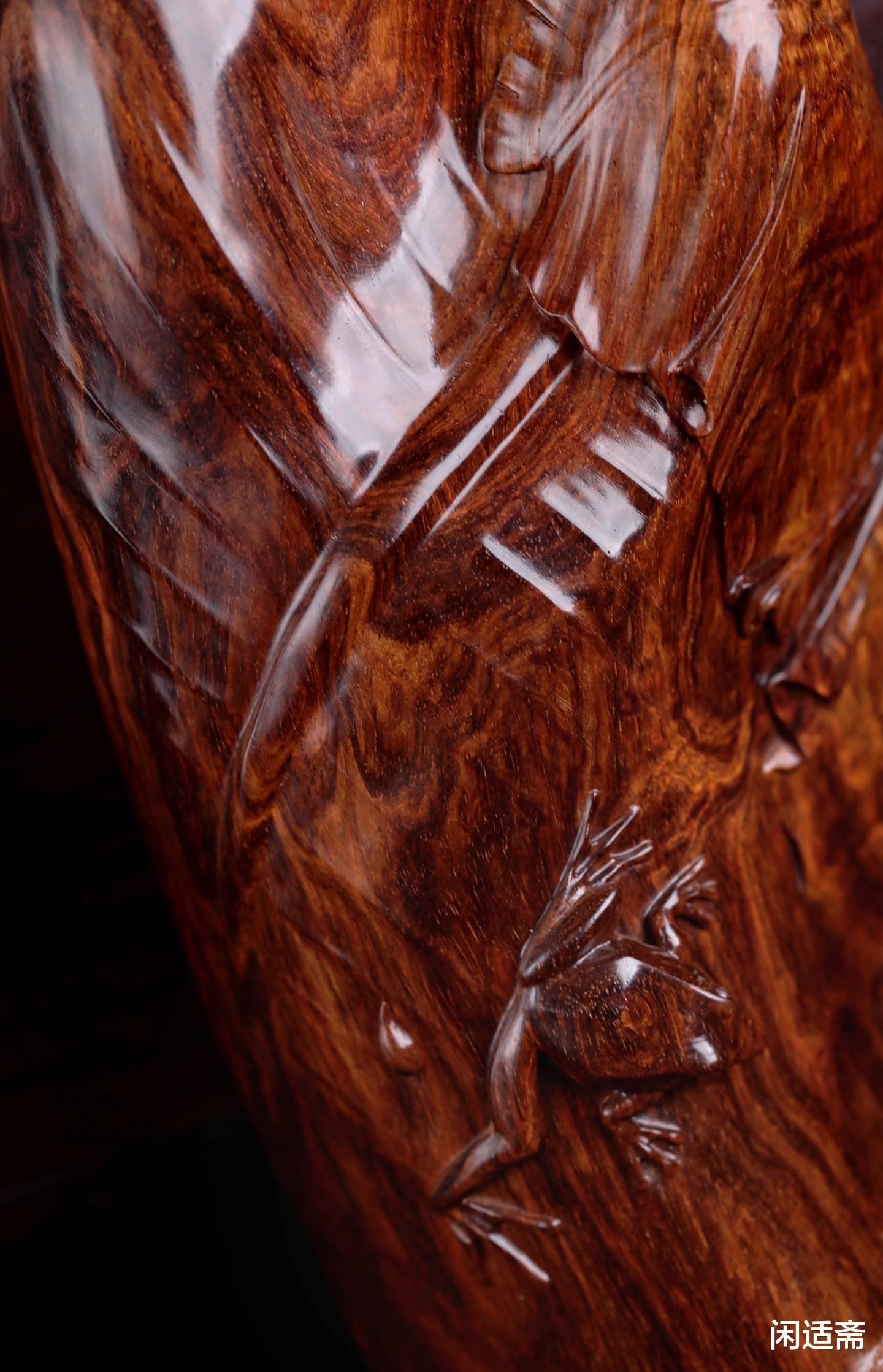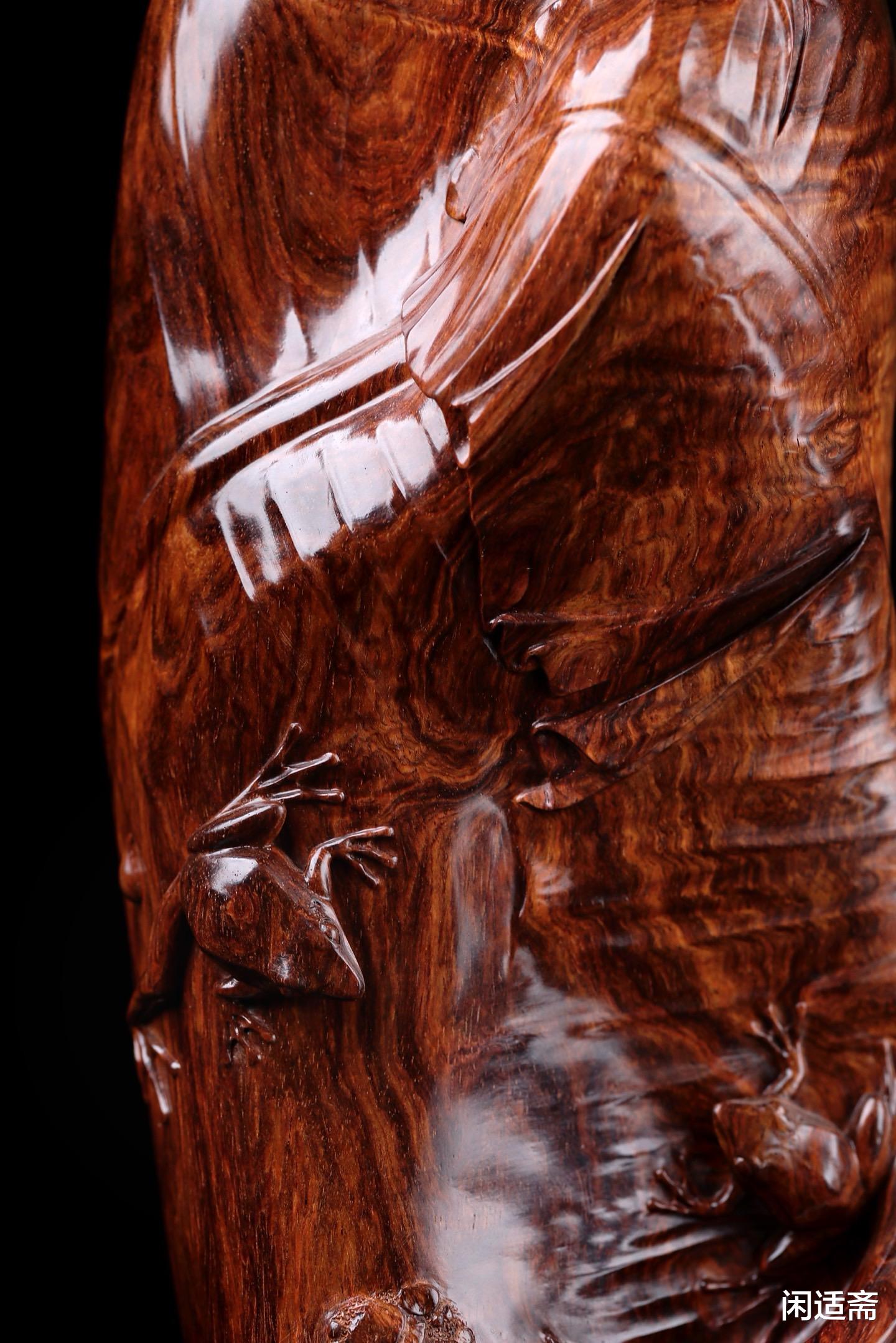 笔筒由匠人手工雕刻,以芭蕉叶为形,深刻技法雕出叶脉舒展、叶缘翻卷的真实质感,刀刀老辣却无匠气;叶间青蛙更显神妙 —— 鼓目昂首,四肢蜷缩欲跃,既有木材天然肌理,又藏生灵跃动之趣,“呱呱来财” 的祥瑞寓意,藏在这方寸之间,雅趣与吉意兼得。