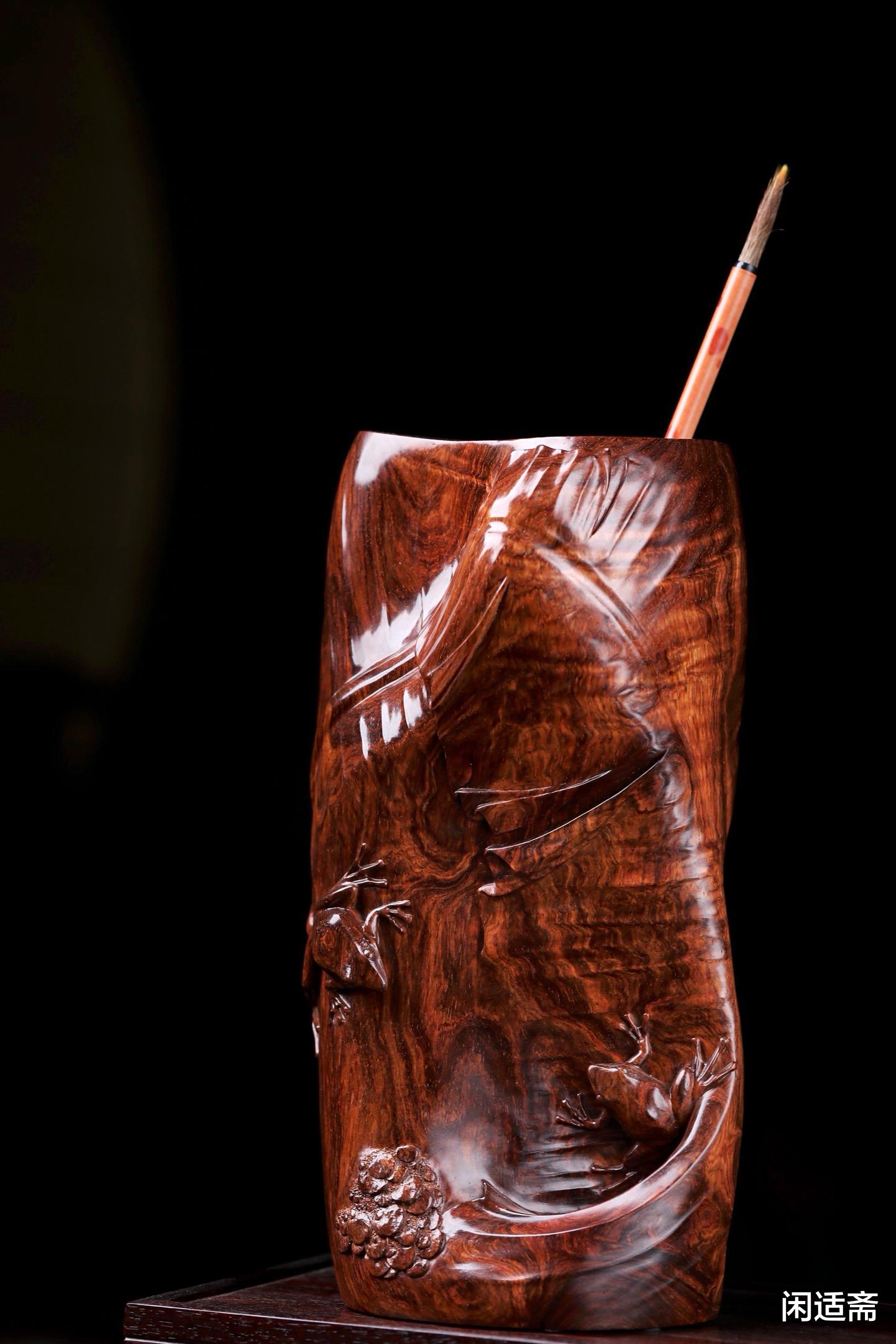 笔筒,自古便是文人书房的 “精神伴侣”。它承托笔墨,收纳文思,既是实用器物,更藏着东方文人对雅致生活的追求 —— 从宋代瓷质笔筒的简约素雅,到明清木雕笔筒的精工巧琢,每一件传世笔筒,都是材质、工艺与文化意趣的融合,见证着千年文脉的流转。而今日所荐的海南黄花梨「呱呱来财」笔筒,更是将文房器物的价值推向极致,堪称当代海黄文玩中的翘楚!
