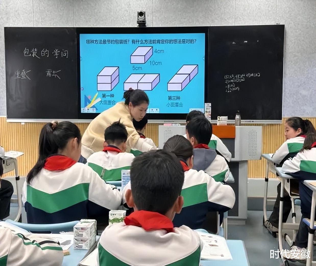 课堂上,邵老师先引导学生认识长方体的“大面、中面、小面”,再通过“两盒牛奶包装”的探究任务,让学生动手尝试不同包装方法,计算对应包装纸面积,在对比中发现“重叠最大面,表面积最小,最省包装纸”的规律,渗透优化思想与数学应用意识。