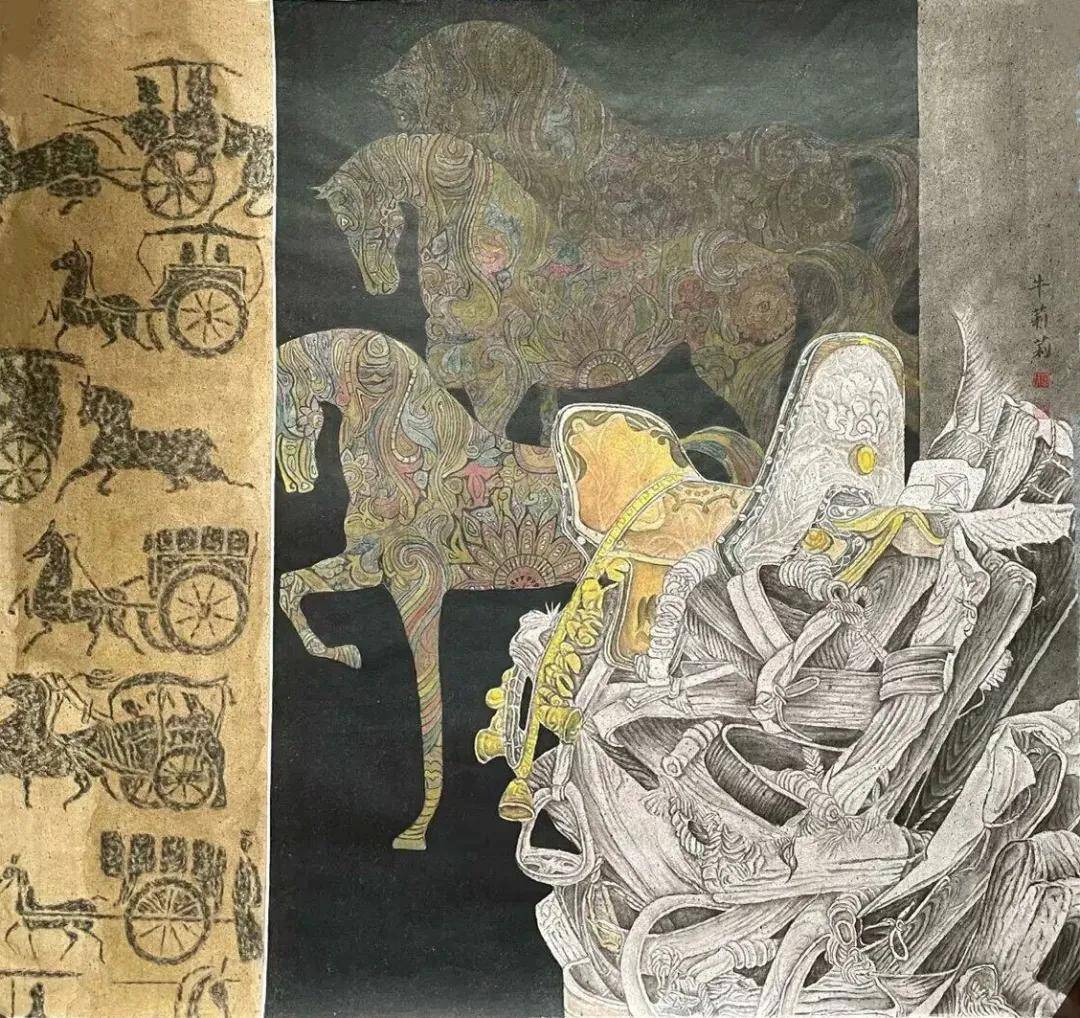 她对传统符号的重构,更体现在《时代的印记》系列中:将汉代画像石的车马纹样与现代工笔的色彩叠加,形成“古今对话”的视觉场域。这种手法暗合了“托物言志”的传统,却将“志”的内涵从文人的个人情怀,扩展为对文化传承的思考。正如郑燮画竹“衙斋卧听萧萧竹,疑是民间疾苦声”,牛莉莉的符号并置,亦是对当代文化生态的一种“笔墨式”发问。
