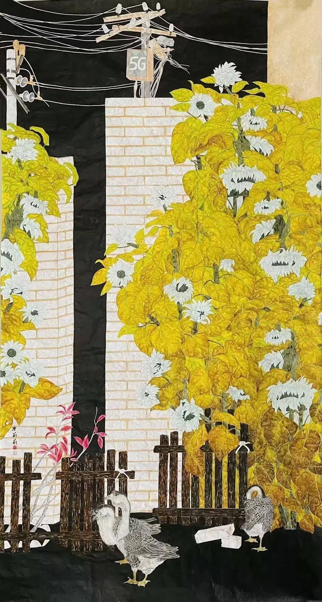 在《金秋家园》中,白色的向日葵攀附在砖墙上,背景的电线与5G信号箱,将农业文明的植物符号与信息时代的技术符号并置一处。这种超现实的组合,并非对传统的解构,而是如潘天寿所说“诗画本一律”的当代实践——向日葵的“向日”意象,在此被赋予了对现代科技的隐喻式凝视,恰似王维“木末芙蓉花,山中发红萼”以花写人的禅意。