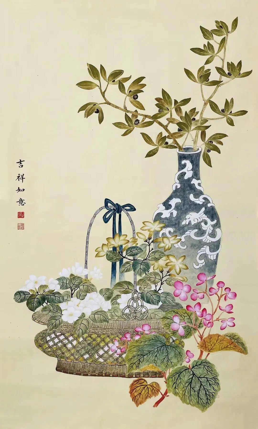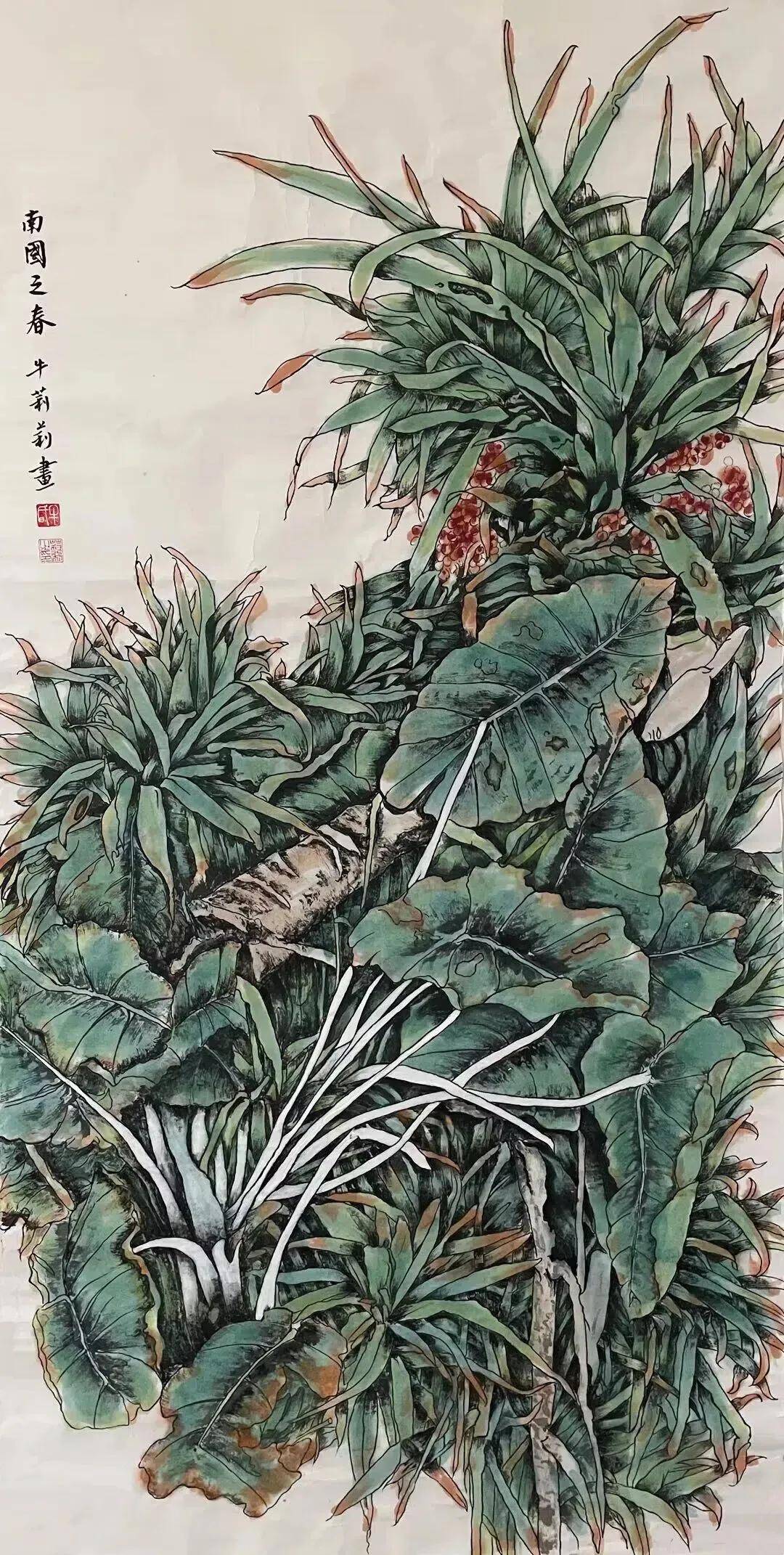 牛莉莉的作品首先让人想起宋代黄筌“富贵”一路的院体花鸟——《吉祥如意》中篮筐的编织纹理、瓷瓶的釉色光泽,皆以“双钩填色”的传统技法层层晕染,一笔一画间尽是“尽精微”的耐心。但她并未止步于“应物象形”,而是如郭熙在《林泉高致》中所言“身即山川而取之”,将自然物象转化为承载精神的符号:《南国之春》里的芭蕉叶,不再是单纯的植物形态,其舒展的轮廓与交错的叶脉,暗喻着南方地域文化的繁茂特质;《南国风情》中朱红背景下的白色藤蔓,以强烈的色彩对比消解了传统工笔的柔媚,生出一种现代艺术的视觉张力。