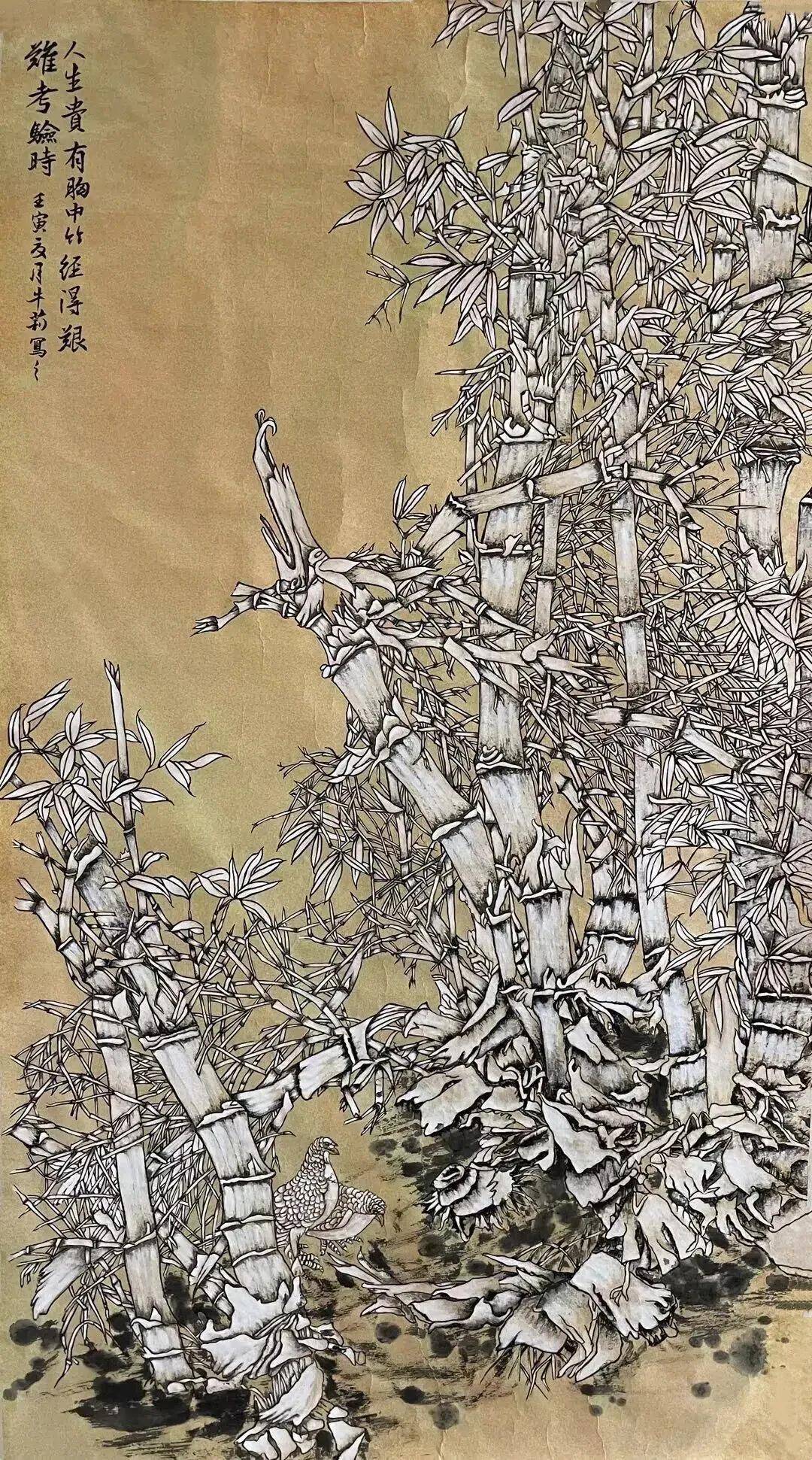 这种“诗画互文”,恰是苏轼“诗画本一律”的生动注脚。她画中的花鸟草木,不再是孤立的物象,而是如“瘦竹如幽人,幽花如处女”般被赋予人格——《静园花开》中,白鹭的垂首姿态与盛放的三角梅形成动静对比,恰似晏殊词中“无可奈何花落去,似曾相识燕归来”的惆怅与生机;《竹林图》里的竹枝“未出土时先有节”,却以扭曲的形态打破了传统竹画的“君子”符号,暗喻着现代社会中个体的精神挣扎。
