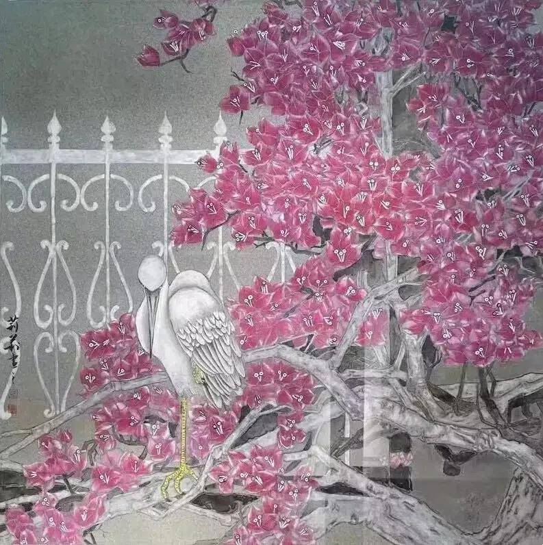 在当代艺术语境中,牛莉莉的工笔花鸟既避免了“泥古不化”的僵化,也拒绝了“全盘西化”的浮躁。她以“立象以尽意”为根基,将传统技法转化为表达当代情感的媒介:既用新材料拓展工笔的质感边界,始终以“气韵生动”为内核;又引入西方构成的视觉逻辑,从未背离“计白当黑”的东方空间观。