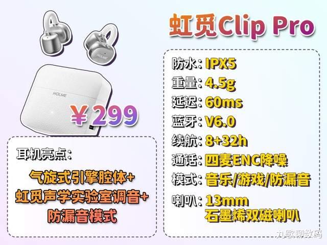 虹觅Clip Pro在音质上采用13mm双磁喇叭,增强驱动力让声音更扎实;还有气旋式引擎腔体能增强气流推动,显著提升低频力度与弹性;同时配备石墨烯科技振膜来保证人声与乐器细节自然清晰;最后经过专业声学调校,让三频衔接都很顺滑,整体听感饱满有层次。佩戴方面采用2.5mm错位设计与12°弧面耳托,搭配仅4.5克的轻巧机身,即使是长时间使用也无负担。性能上支持防漏音模式,安静环境使用更安心;具备智能一拖二连接,切换设备方便;通话清晰,并拥有日常防水与持久续航。