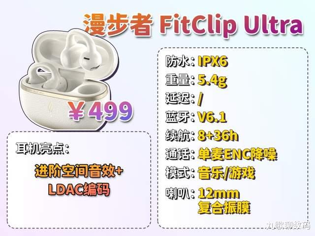 漫步者FitClip Ultra在音质上搭载12mm复合振膜,确保中低频扎实饱满;进阶空间音效拓宽了声场,增强了听歌观影时的立体临场感;同时支持LDAC高清编码,能保留更丰富的音乐细节,使人声清晰、乐器分离分明,整体听感均衡且层次丰富。佩戴上采用多曲率软梁与柔韧镍钛合金丝,5.4克机身佩戴轻盈舒适,但稳固性一般,运动时会有松动。性能上具备IPX6级高防水,无惧汗水和雨水;36小时总续航非常持久;但它的单麦通话降噪效果普通,嘈杂环境下通话清晰度一般。