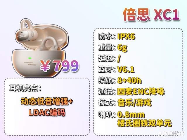 倍思 XC1在音质上采用圈铁双单元,结合了动圈的饱满氛围与动铁的清晰解析力,声音细节丰富;SuperBass 3.0动态低音增强技术能智能强化低频,让鼓点更深沉有力;同时支持LDAC高清编码,能保留更多音乐细节,整体听感均衡且层次分明。佩戴上采用云朵气囊与镍钛合金丝,触感柔软并能分散压力,长时间佩戴舒适,但稳固性一般,运动时需留意。性能上具备四麦通话降噪,通话清晰,还支持IPX6级防水;并拥有长达40小时的总续航,性能表现非常突出。