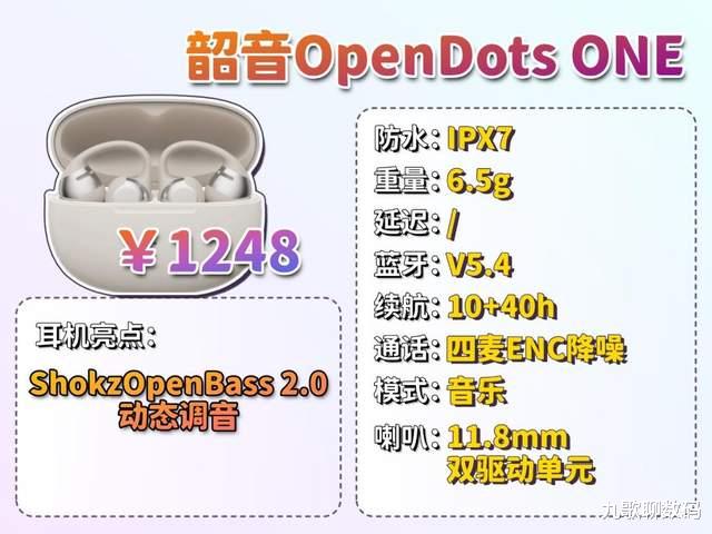 韶音OpenDots ONE在音质上采用11.8mm双驱动单元,结合了独立负责中低频与高频的单元结构,使声音层次分明,人声清晰通透;加上ShokzOpenBass 2.0动态调音技术,能智能优化低频响应,让鼓点扎实有弹性,整体听感均衡有力。在佩戴上有着C形桥设计与不对称弧形的结构,加上6.5克机身能温和贴合不同耳廓,长时间使用舒适无压力。在性能上支持一拖二连接,可同时配对两台设备;具备四麦ENC通话降噪与IPX4日常防水;总续航达40小时,满足多日使用需求。