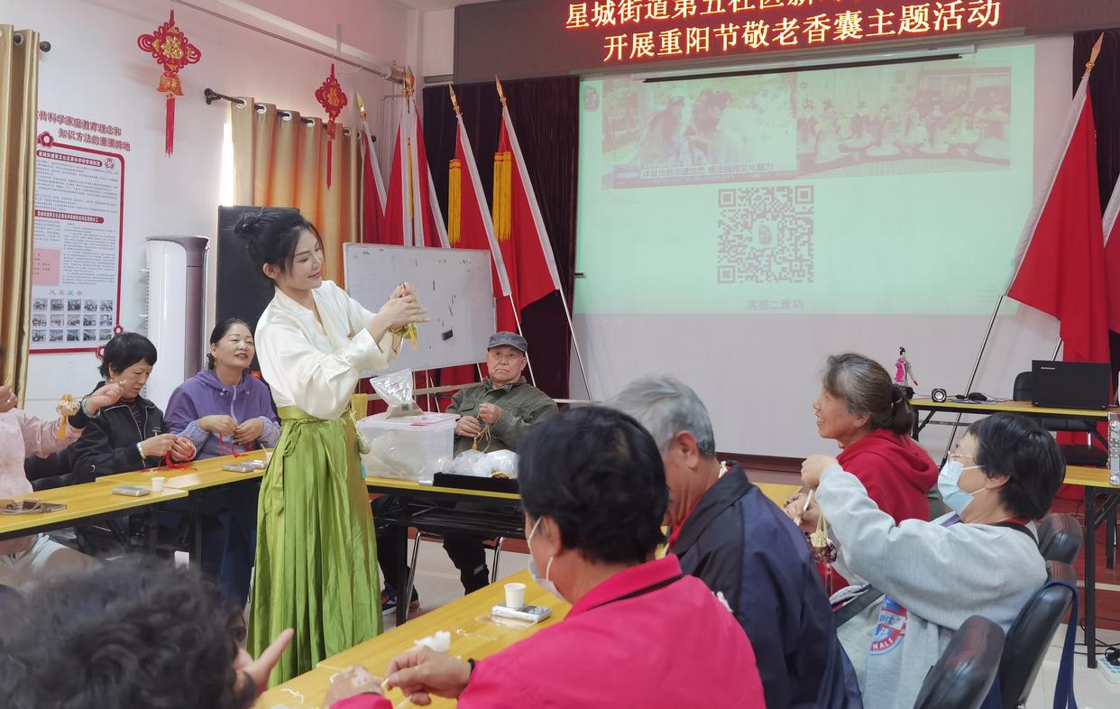 星城街道在重阳节期间举办了多场特色活动,共谱敬老新篇。敬老香囊主题活动里,志愿者讲述重阳习俗与历史,在老师的指导下,志愿者与老年居民一同制香囊,草药芬芳与欢笑交融,老人们手捧成果,倍感温暖。同时,第三社区的重阳扎染文化活动,老师详解扎染文化,带居民领略传统染色工艺魅力。营造了浓厚节日氛围,加深了居民对传统文化认知,让老人尽享节日欢乐。