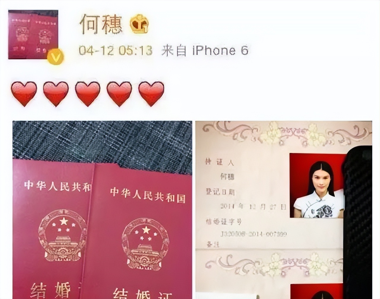 02 何穗的神秘婚史在与陈伟霆在一起之前,何穗其实有过一段颇为神秘的婚姻。2015年4月,一向对感情生活保密的何穗,突然在微博上晒出了一张结婚证照片,让众人大吃一惊。
