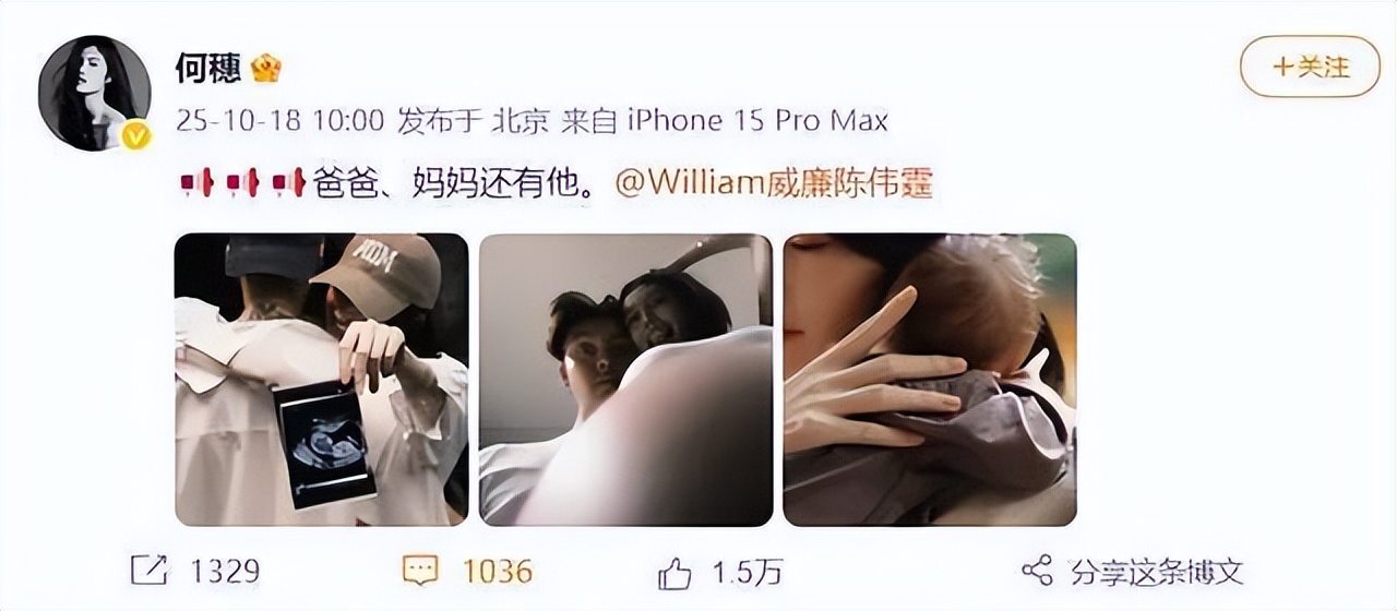 10月18日,陈伟霆和何穗同时在微博晒出B超照、孕期照和一家三口的合照,简单配文“爸爸、妈妈还有他”,瞬间引爆网络。这对一直被传分分合合的明星情侣,竟然直接跳过了公开恋情、结婚等环节,突然宣布有了孩子,让网友们措手不及。