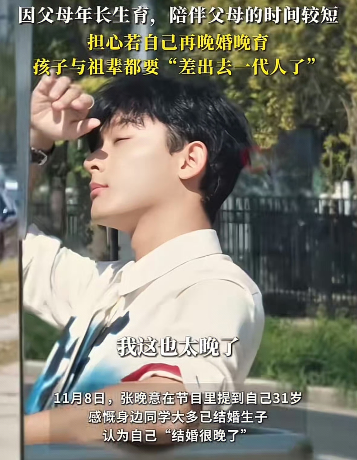 在《花儿与少年·同心季》节目中,31岁的张晚意坦然面对镜头,聊起了自己的婚育焦虑。他感慨身边同学大多已结婚生子,对比之下自觉“进度落后”,言语间流露出一种时不我待的紧迫感。更触动人心的是,他的焦虑并非简单地源于社会比较,而是源于对亲情联结的深切珍视。因父母年长生育自己,张晚意陪伴父母的时间相对有限,他担心若自己再晚婚晚育,下一代与祖辈的相处时间将更短,从而产生“差出去一代人”的遗憾。这番真情实感的流露,瞬间在社交平台掀起波澜,无数网友直呼“看到了自己”。