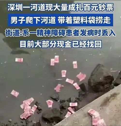 宝安区新安街道相关负责人透露,河道内散落的现金,竟然是一名精神障碍患者叶某发病期间丢弃的,目前大部分现金已经被找回,叶某也被家属带回去照顾。